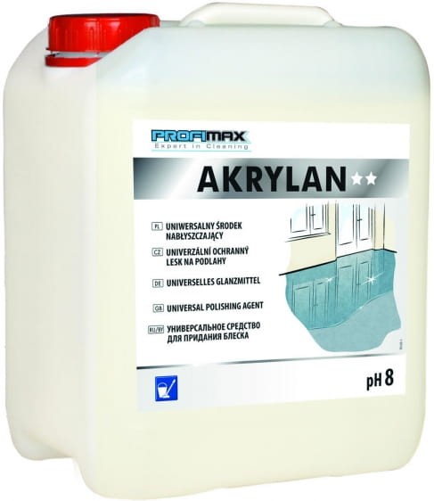 Środek tworzy szybkoschnącą, gładką powłokę o wysokim połysku bez konieczności polerowania. Powłoka skutecznie zabezpiecza przed brudem, zadrapaniami i ścieraniem. Odpowiednio dobrany system woskowy wpływa na właściwości hydrofobowe chroniąc powierzchnię przed wnikaniem wody. Sukcesywne polerowanie Akrylanu wysokoobrotowymi maszynami podnosi efekt połysku i usuwa rysy oraz ślady powstałe podczas eksploatacji. pH 8