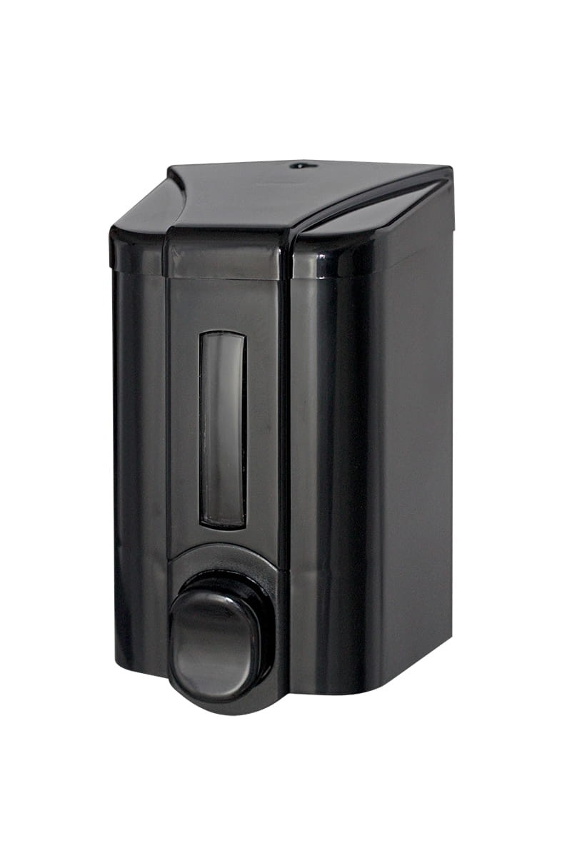 Dozownik mydła w płynie 500 ml to niedrogi, naścienny podajnik, wykonany z uniwersalnego, czarnego plastiku ABS. Jest bardzo funkcjonalny i łatwy w użyciu. Mydło, nalewane prosto z kanistra, w prosty sposób dozuje się wciskając przycisk. Wbudowane okienko pozwala wygodnie kontrolować ilość substancji wewnątrz. Dozownik do mydła zamykany jest na kluczyk. Nadaje się do miejsc o niskim i średnim natężeniu ruchu.