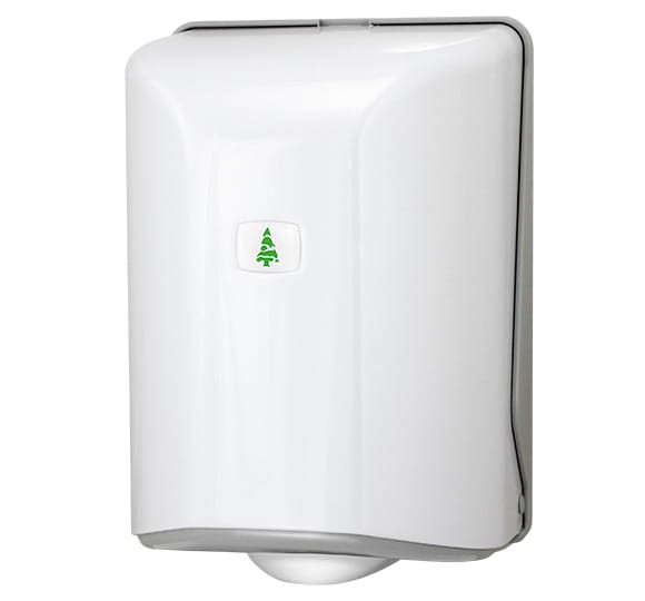 Elegancki i nowoczesny dystrybutor pojemników na ręczniki w rolce. Wykonany jest z wzmocnionego tworzywa ABS w kolorze białym. Kształt pojemnika jest opływowy. Dozownik posiada świetne właściwości odporne na zarysowania oraz inne uszkodzenia mechaniczne. Zawartość pojemnika jest zabezpieczona przed kradzieżą dzięki temu, że dystrybutor jest zamykany i otwierany na plastikowy kluczyk. Dozownik wyposażony jest w okienko umożliwiające kontrolę poziomu zawartości. Nie ma potrzeby dotykania pojemnika, ze względu na sposób dozowania ręcznika - jest on wyciągany od dołu. Rolka jest rozwijana od środka tulei.